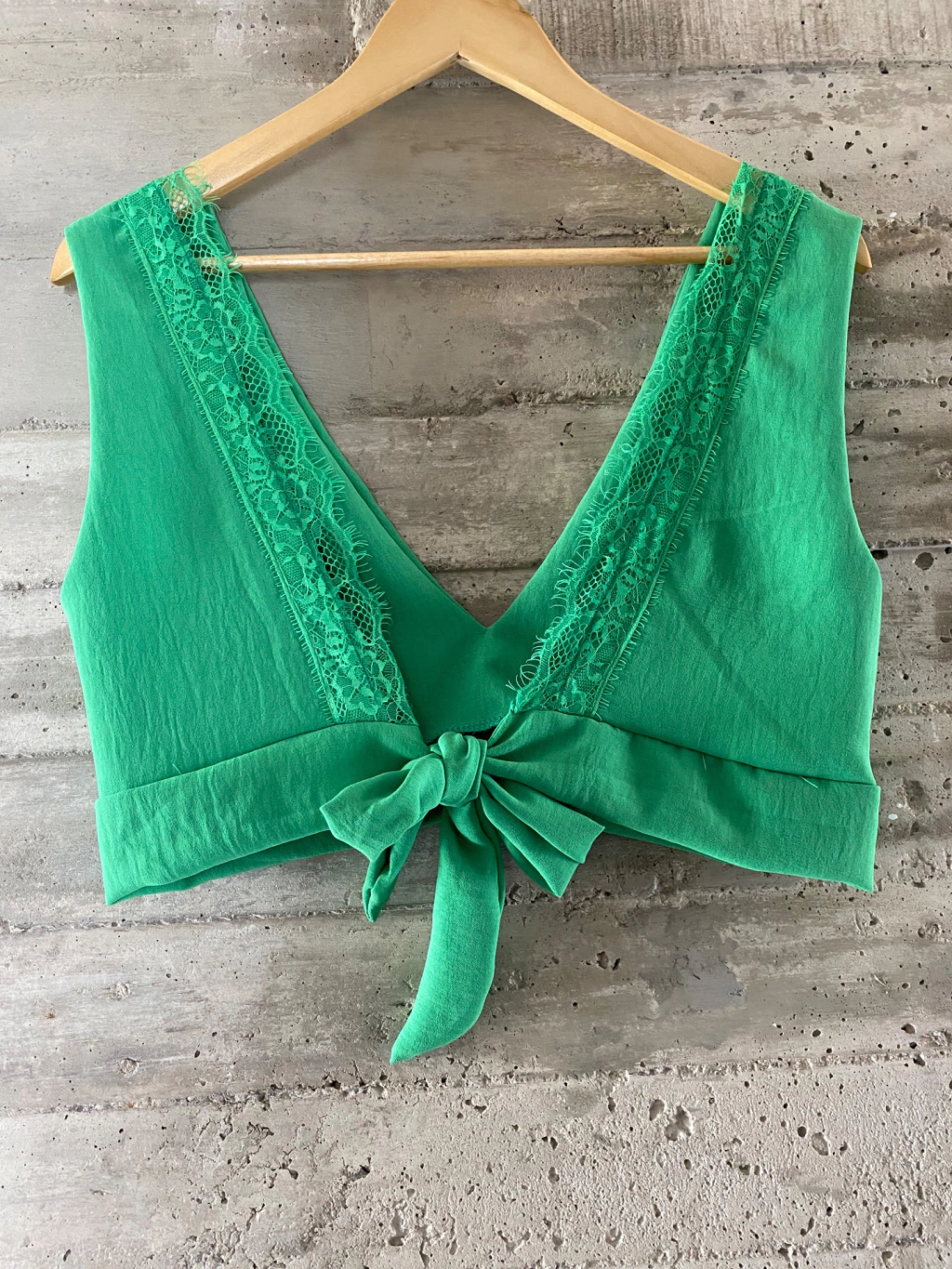 Blusa con escote en V ajustable en la parte de la espalda con moño, detalles en encaje